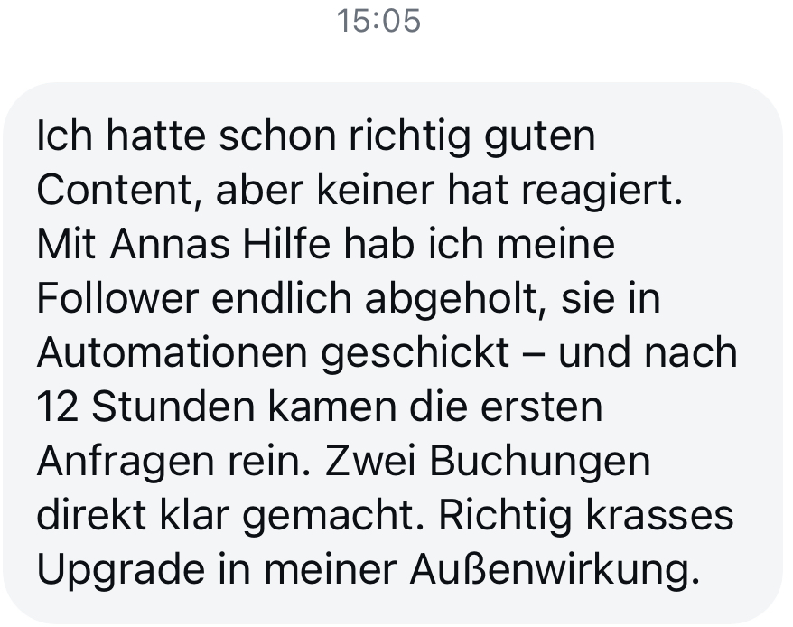 Das habe ich durch mein eigenes 48h-Automations-System geschafft, das aus meinem Instagram-Profil und meine Ideen für meine Kunden planbare und regelmäßige Anfragen macht.
